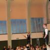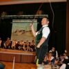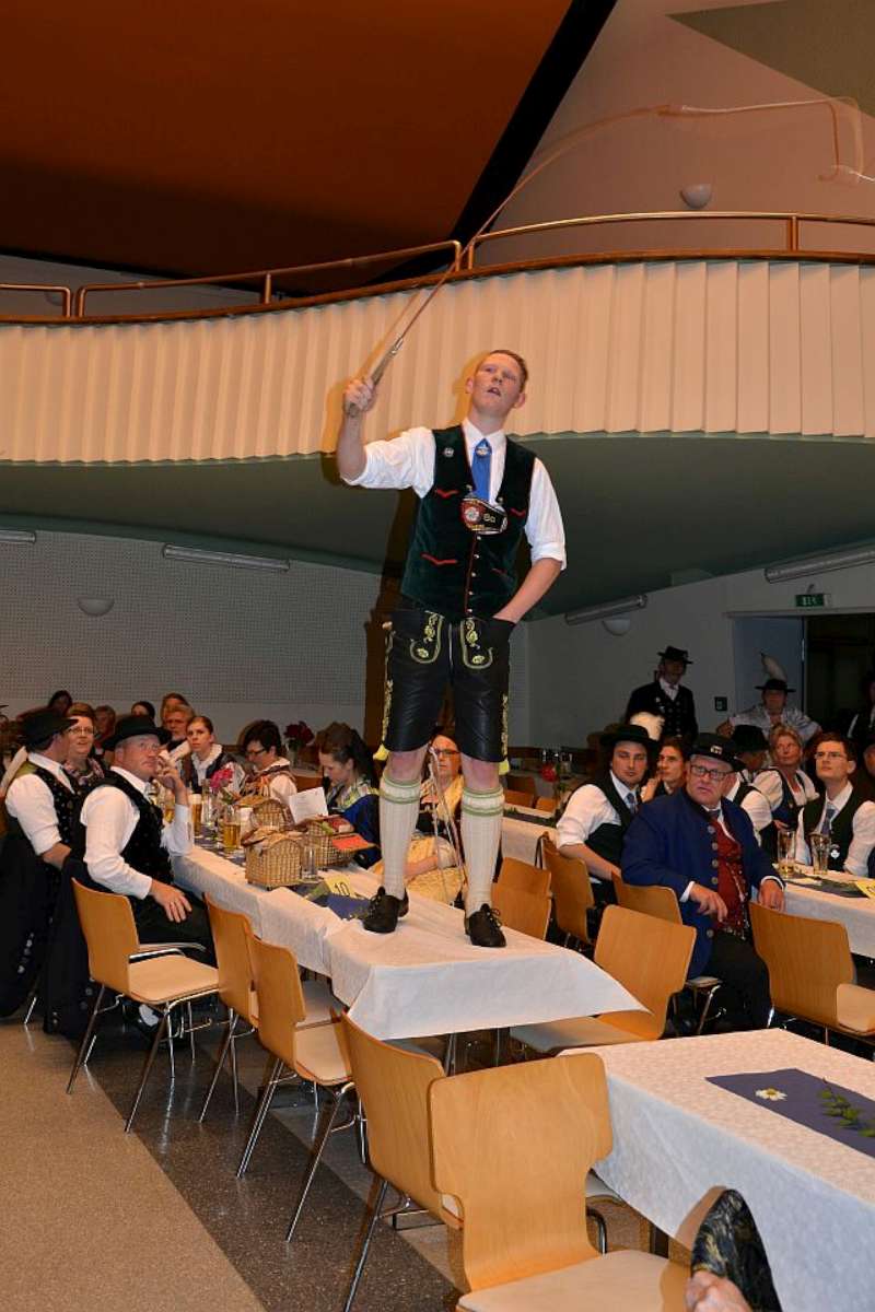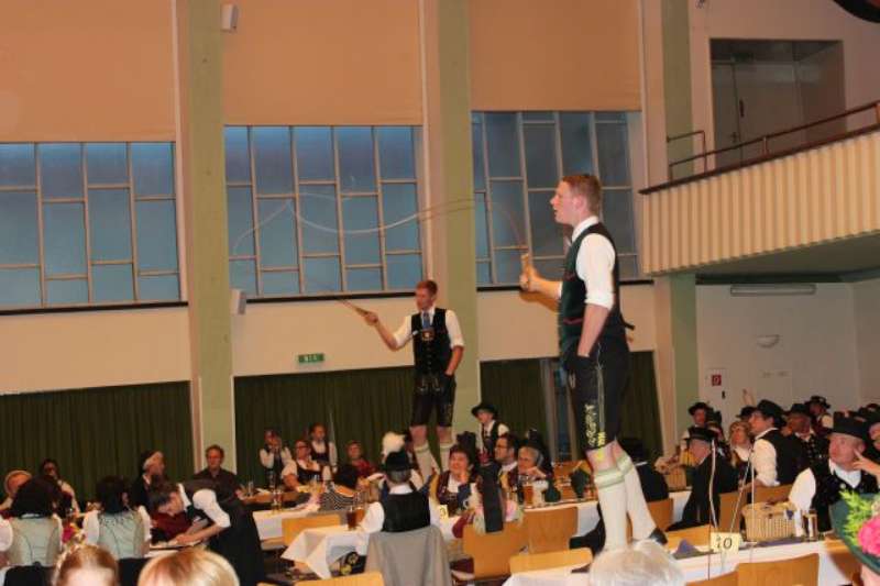 Große Aufregung herrschte bei unseren Goaßlschnalzern, die an diesem Abend ihren ersten öffentlichen Auftritt meisterten. Begleitet von der Festmusik zeigten sie mit der Sternpolka und der Ambospolka ihr Können. Auch sie erhielten einen tosenden Applaus, der die Gesichter der vier angespannten Akteure freudig aufhellen ließ. Unsere Aktivengruppe zeigte das Mühlradl und die Burschen den Bankerlplattler, bevor es, leider viel zu früh (bedingt durch die Lenkzeit des Busfahrers) zurück ins Hotel ging. Mit lustigen Vereinsanekdoten von den früheren Vereinsausflügen der „Alt Rosenheimer Koffertrachtler“, ließen wir den Abend mit einem Absacker auf der Hotelterrasse ausklingen.