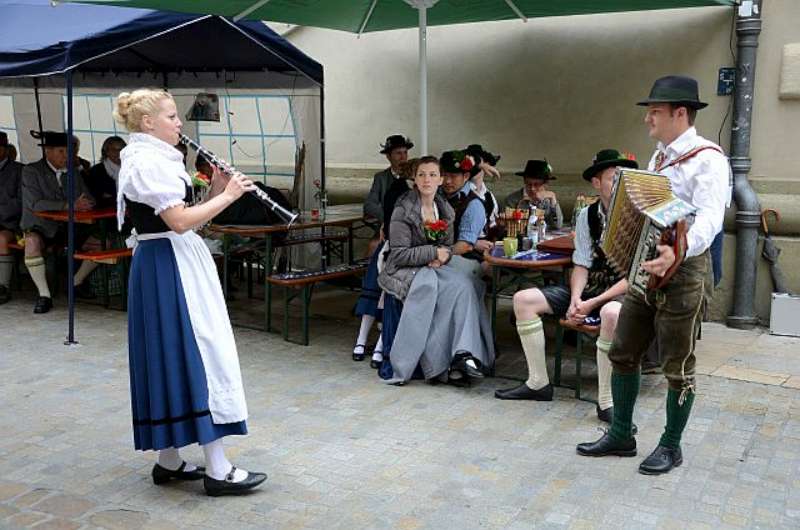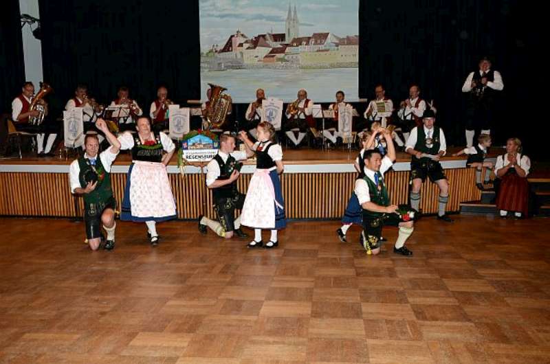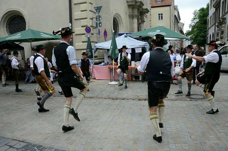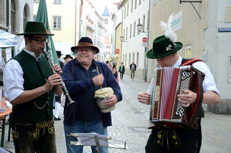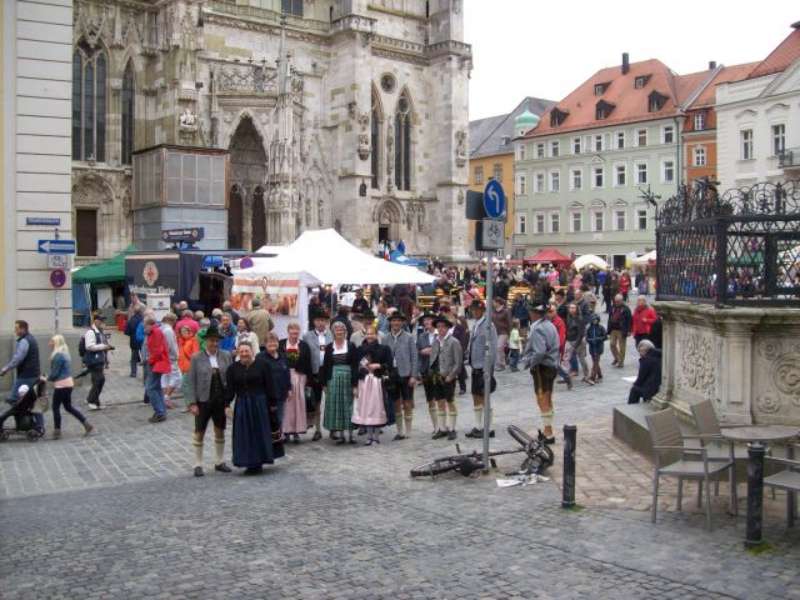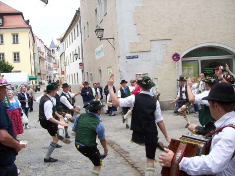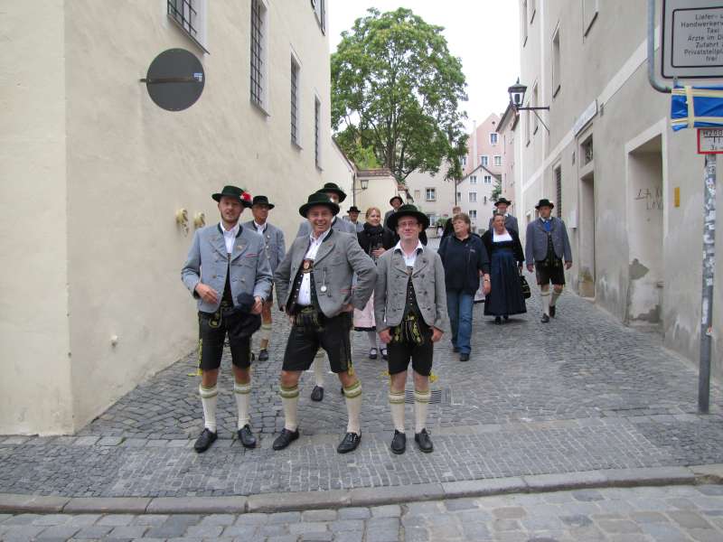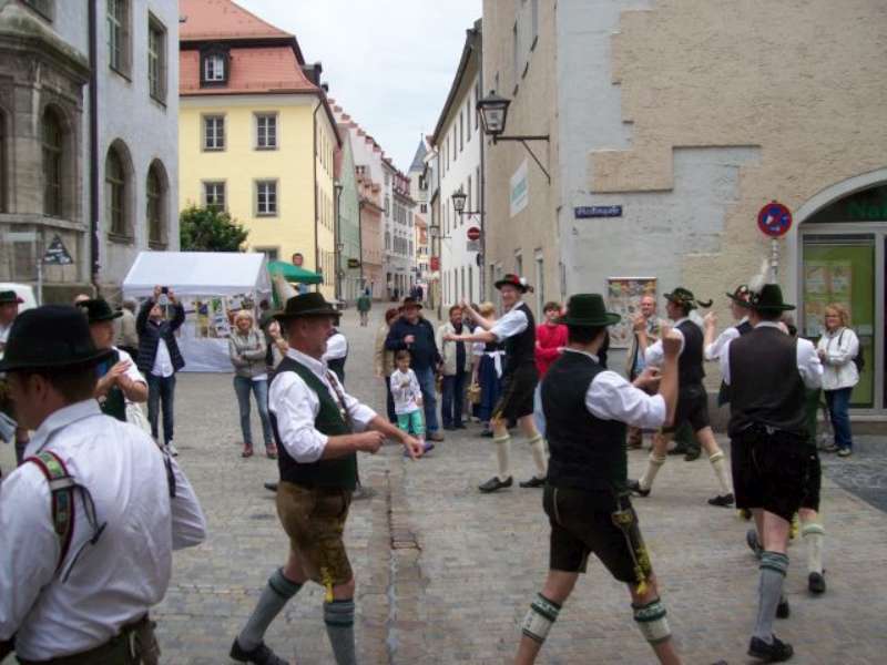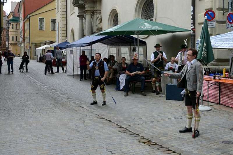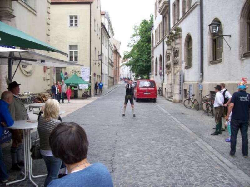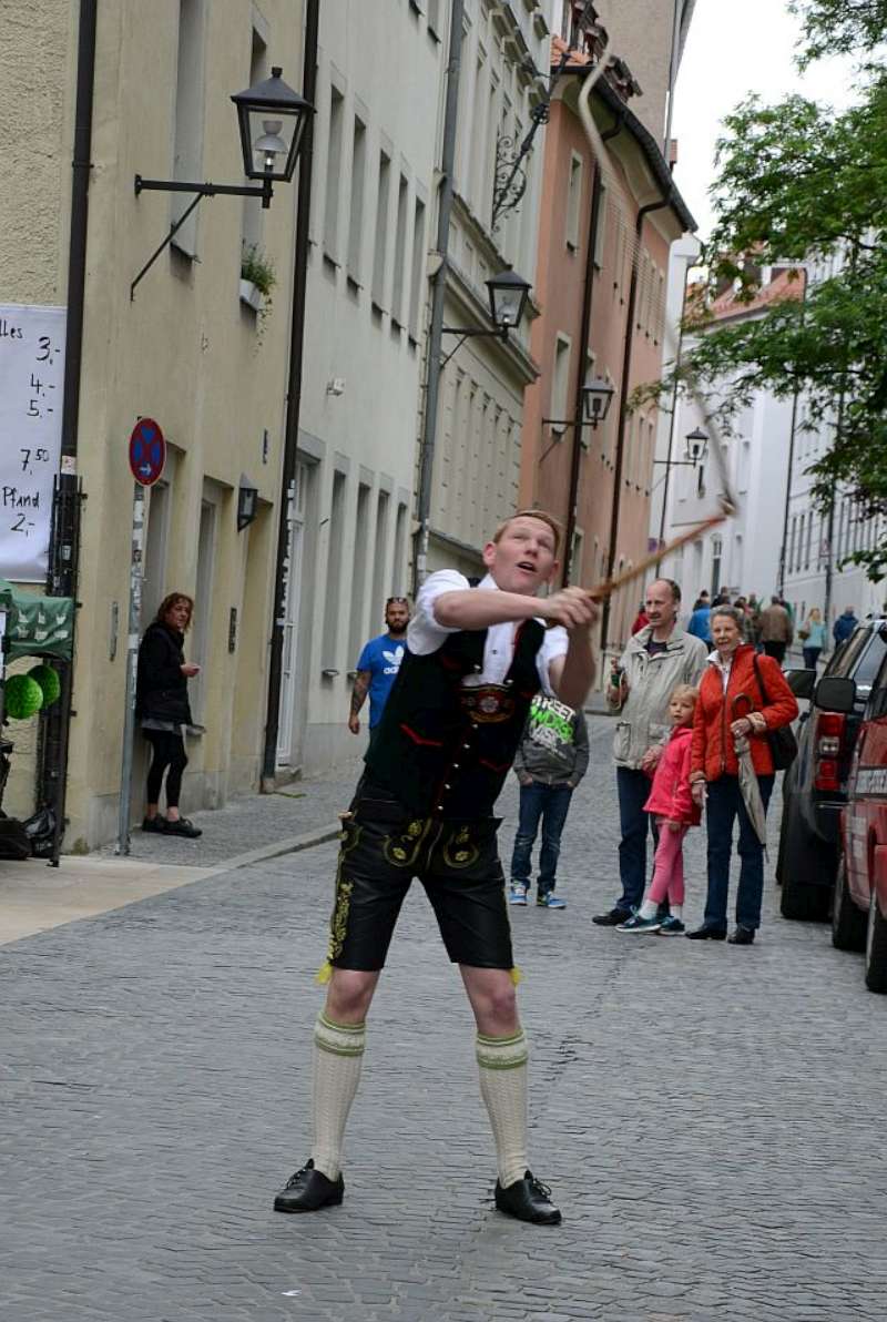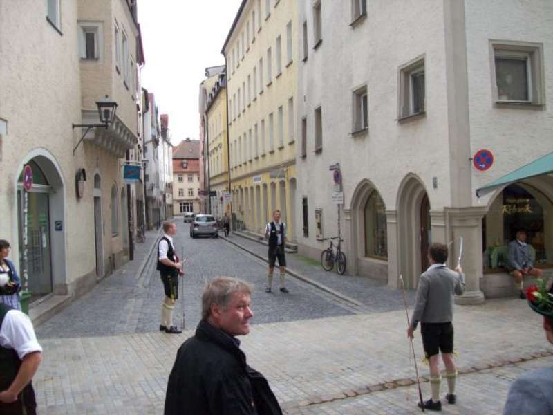 Nach einer, für so manchen kurzen Nacht, machten wir uns nach einem reichhaltigen Frühstück auf den Weg in die Regensburger Altstadt, zum Stand unserer Gastgeber auf dem Stadtfest. Bis zum Eintreffen unserer Stadtführer aus den Reihen der „Almrauscher“ wurde Musik gemacht, Kaffee getrunken und die am Stand dargebotenen Köstlichkeiten verzehrt. Unsere „Jungen“, nutzten die Gelegenheit um ihre Schnalzerkünste vorzuführen und sich im Aperschnalzen zu probieren.